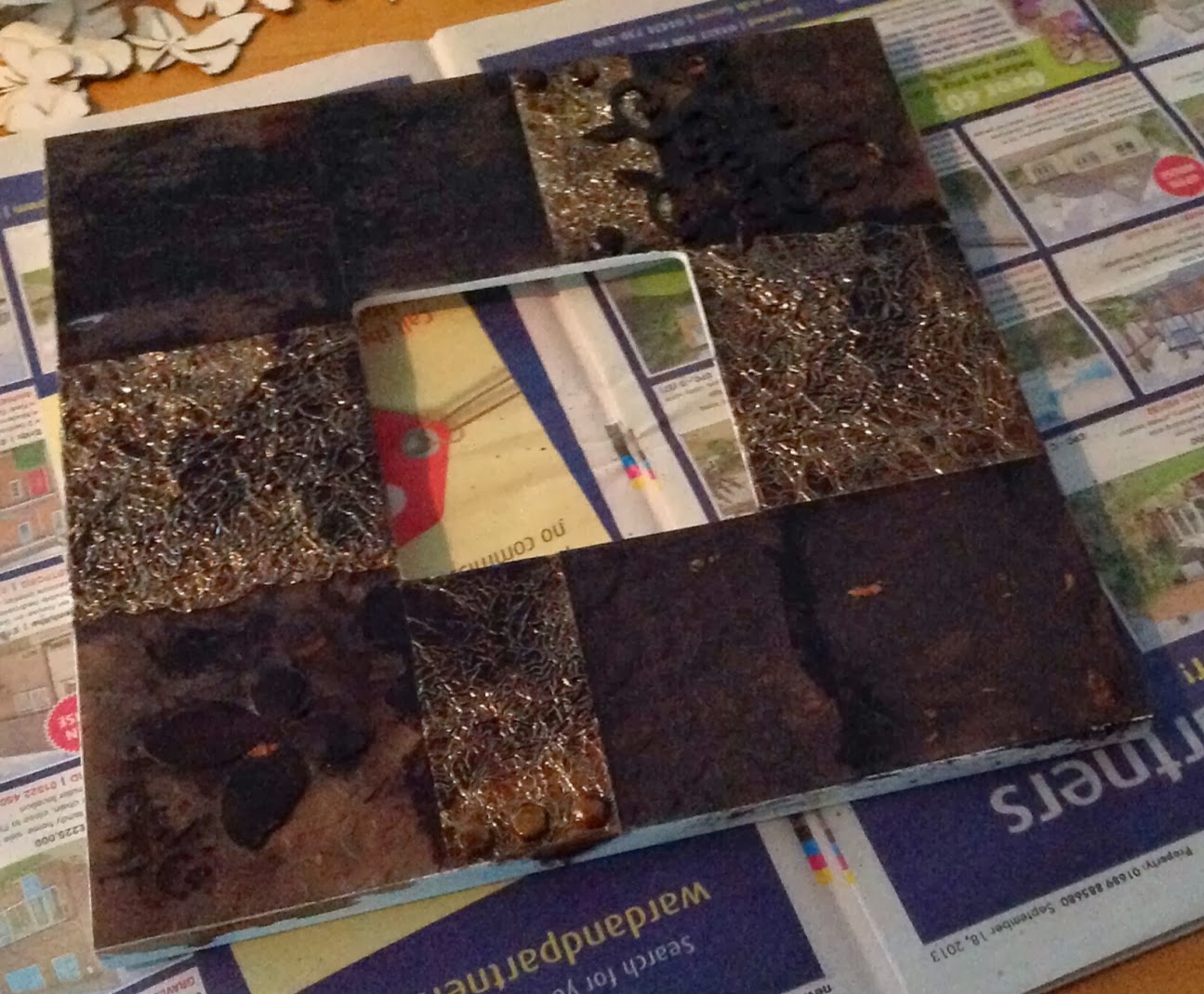 Using white card I built up a collage effect creating different sections and glued these onto the frame.